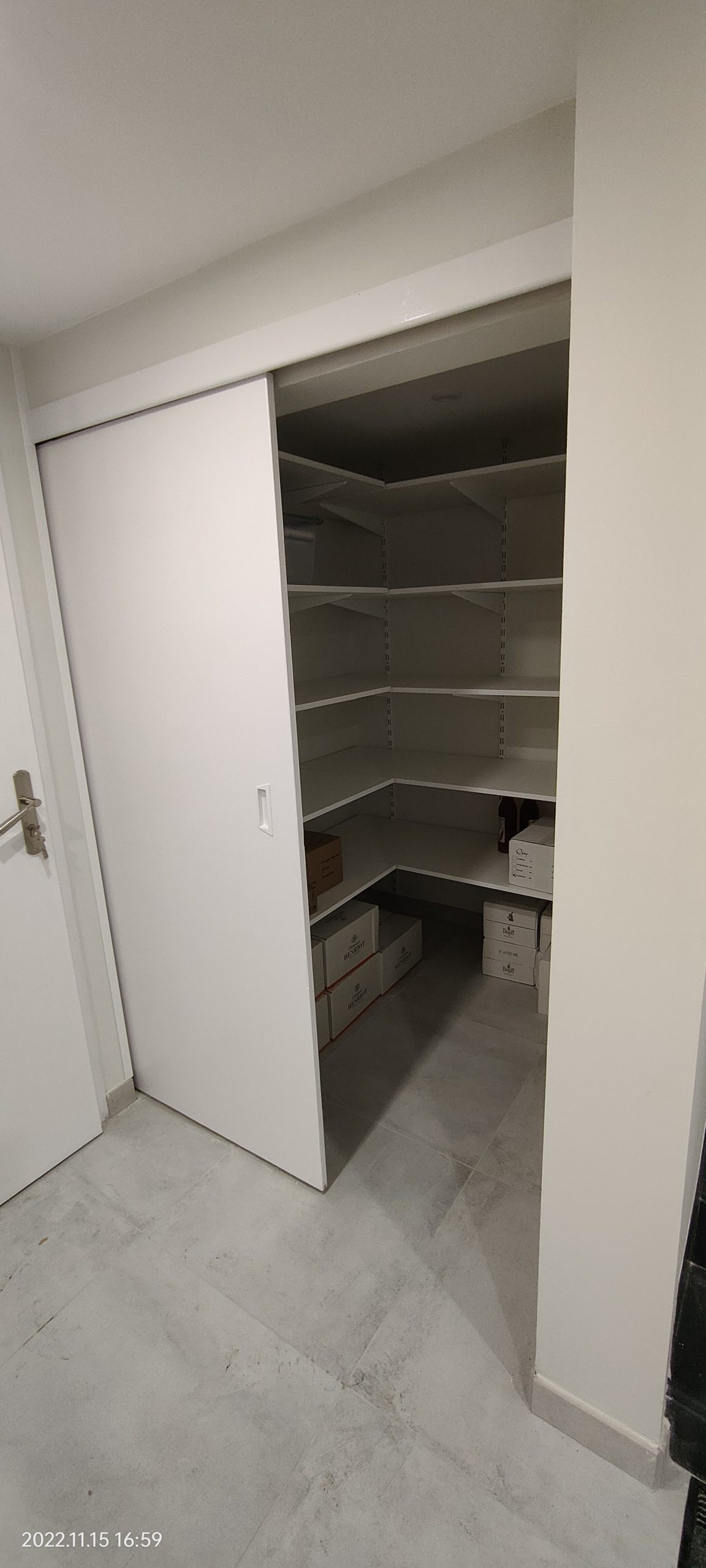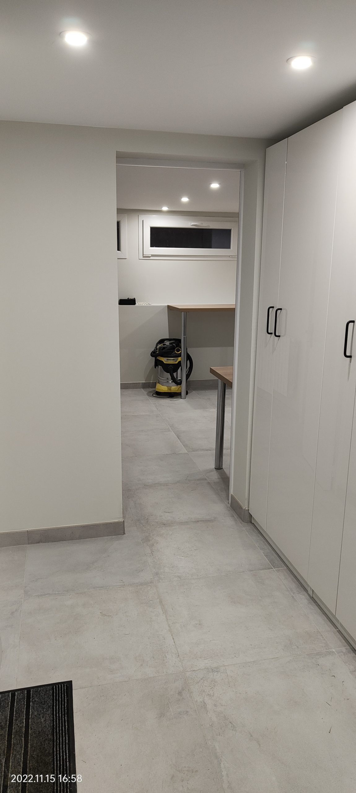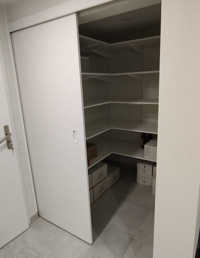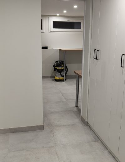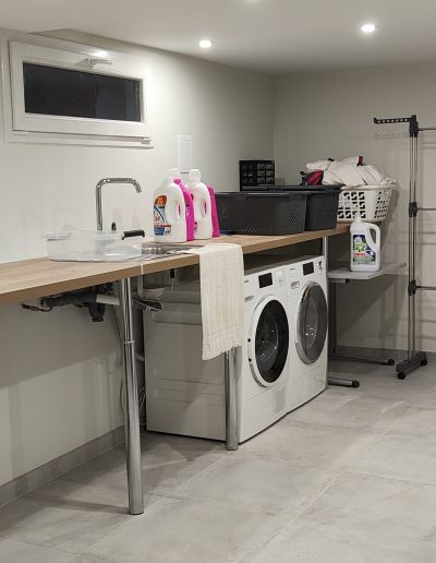 Aménagement Fonctionnel : Création d’un espace cellier sur mesure avec pose de rayonnages et d’une porte coulissante pour optimiser le dégagement. La zone buanderie a été entièrement repensée avec des raccordements en plomberie et électricité encastrés pour un rendu net.