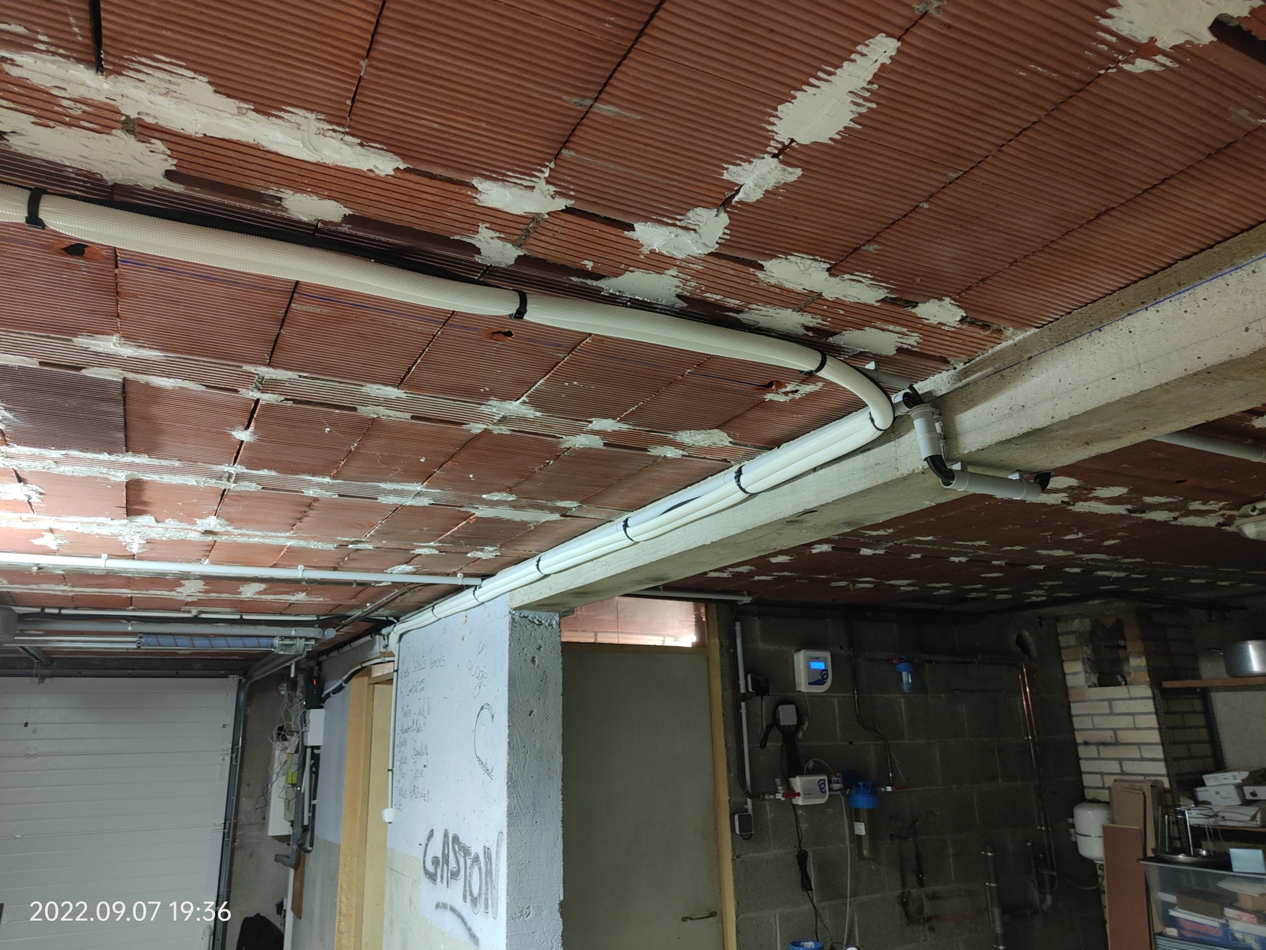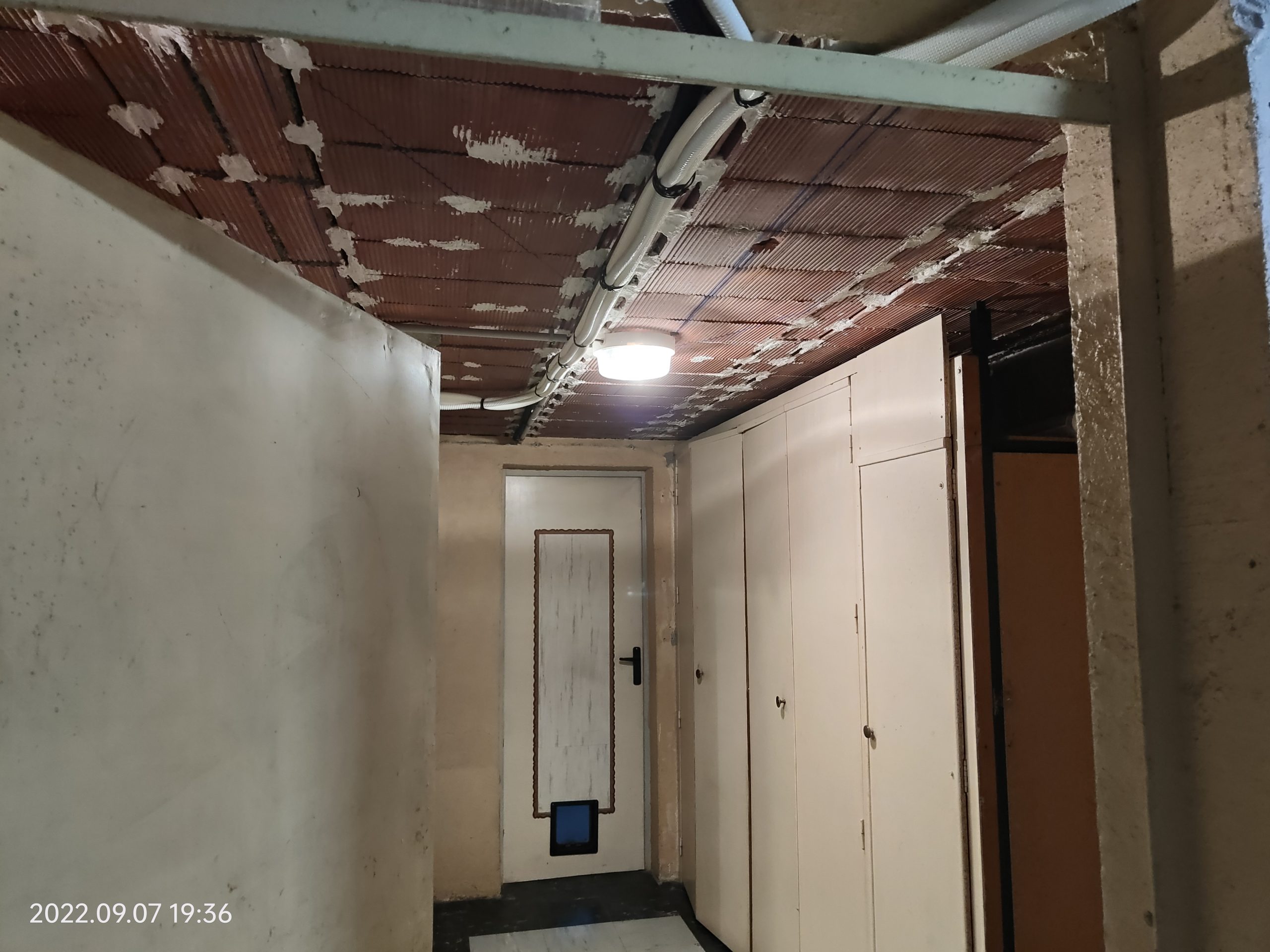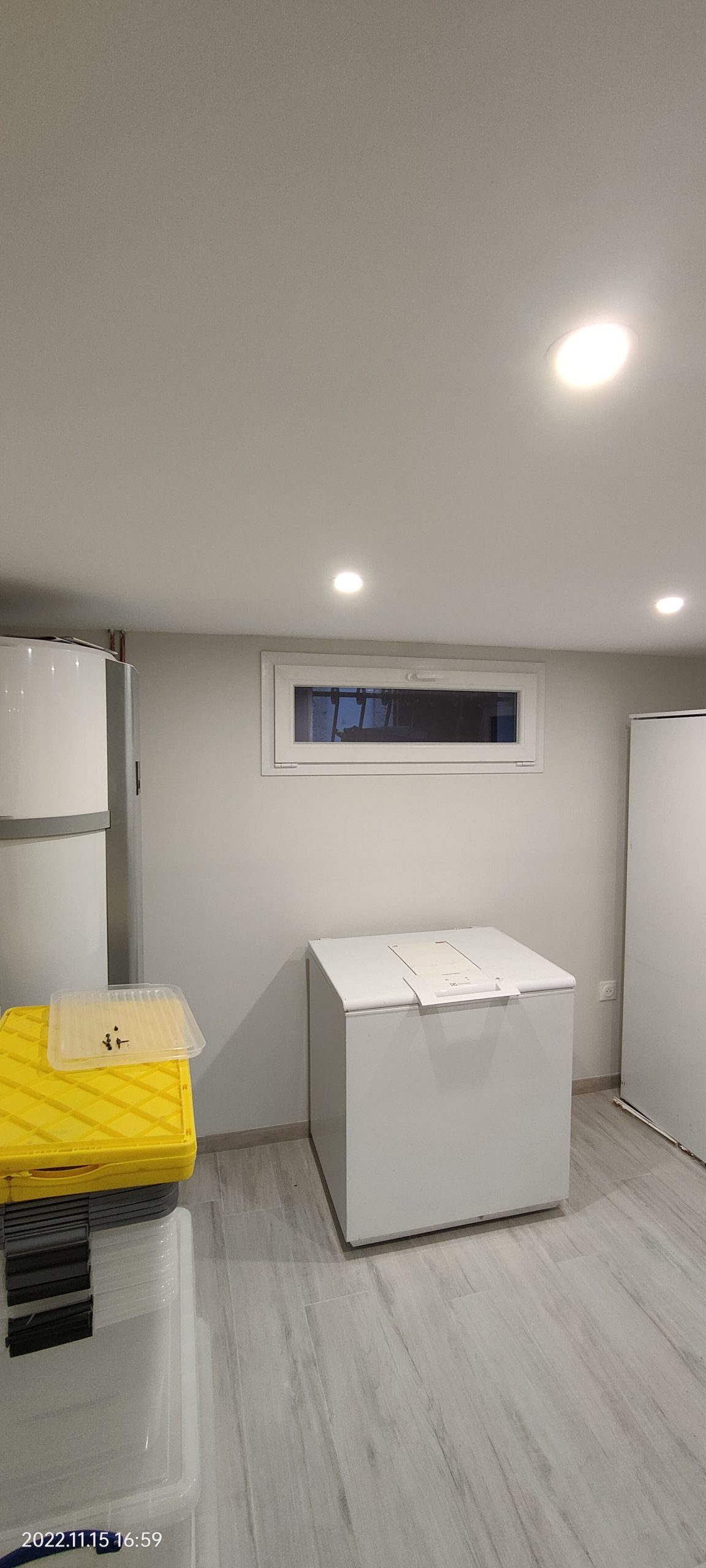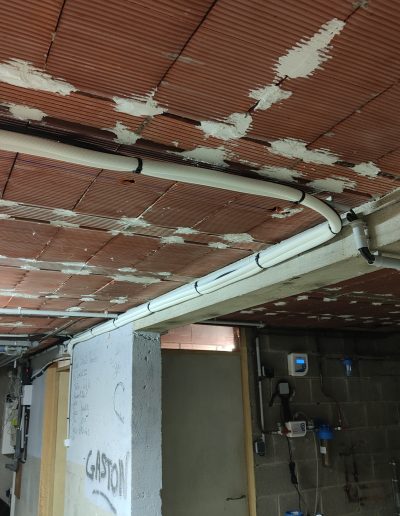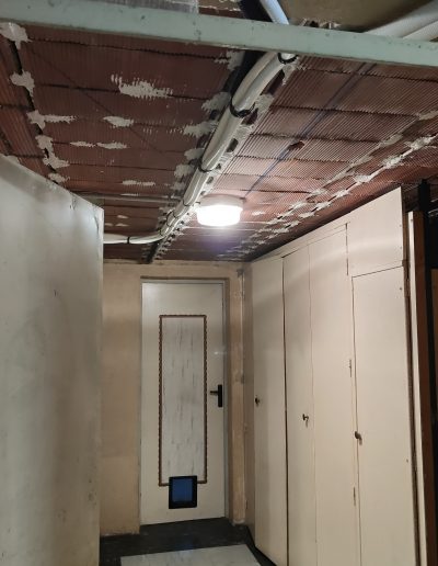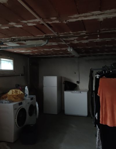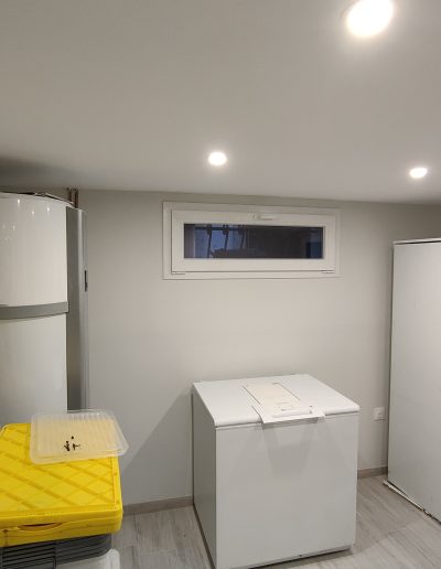 Assainissement & Isolation : Traitement des parois et pose d’un complexe isolant haute performance. La création de faux plafonds en placo a permis de dissimuler proprement les réseaux de tuyauterie et d’électricité tout en intégrant des éclairages LED modernes.