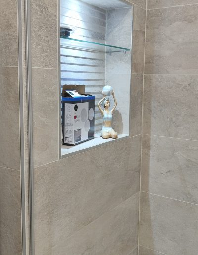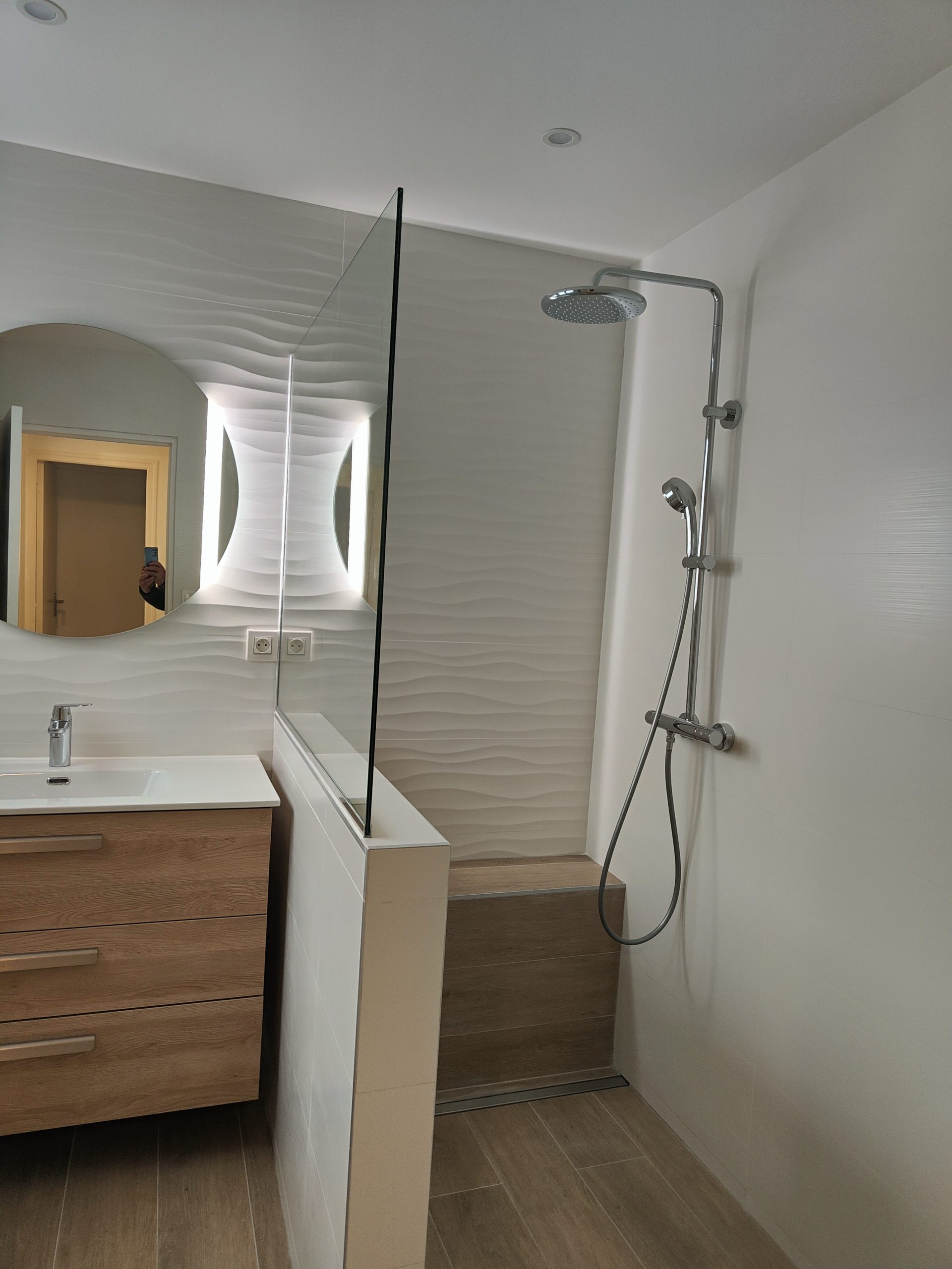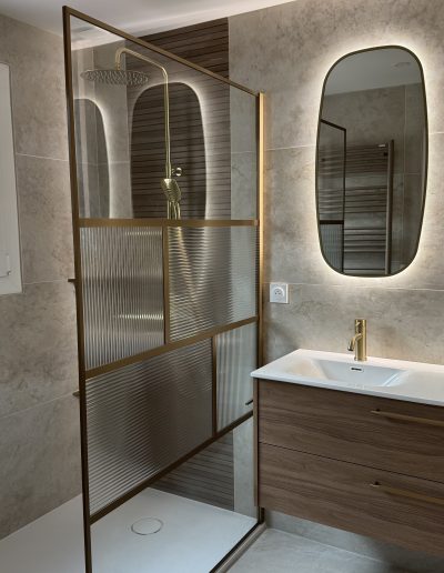 Expertises déployées : Plomberie sanitaire (douche italienne, robinetterie encastrée), Électricité (éclairage LED), Carrelage et Faïence, Menuiserie (mobilier sur mesure).