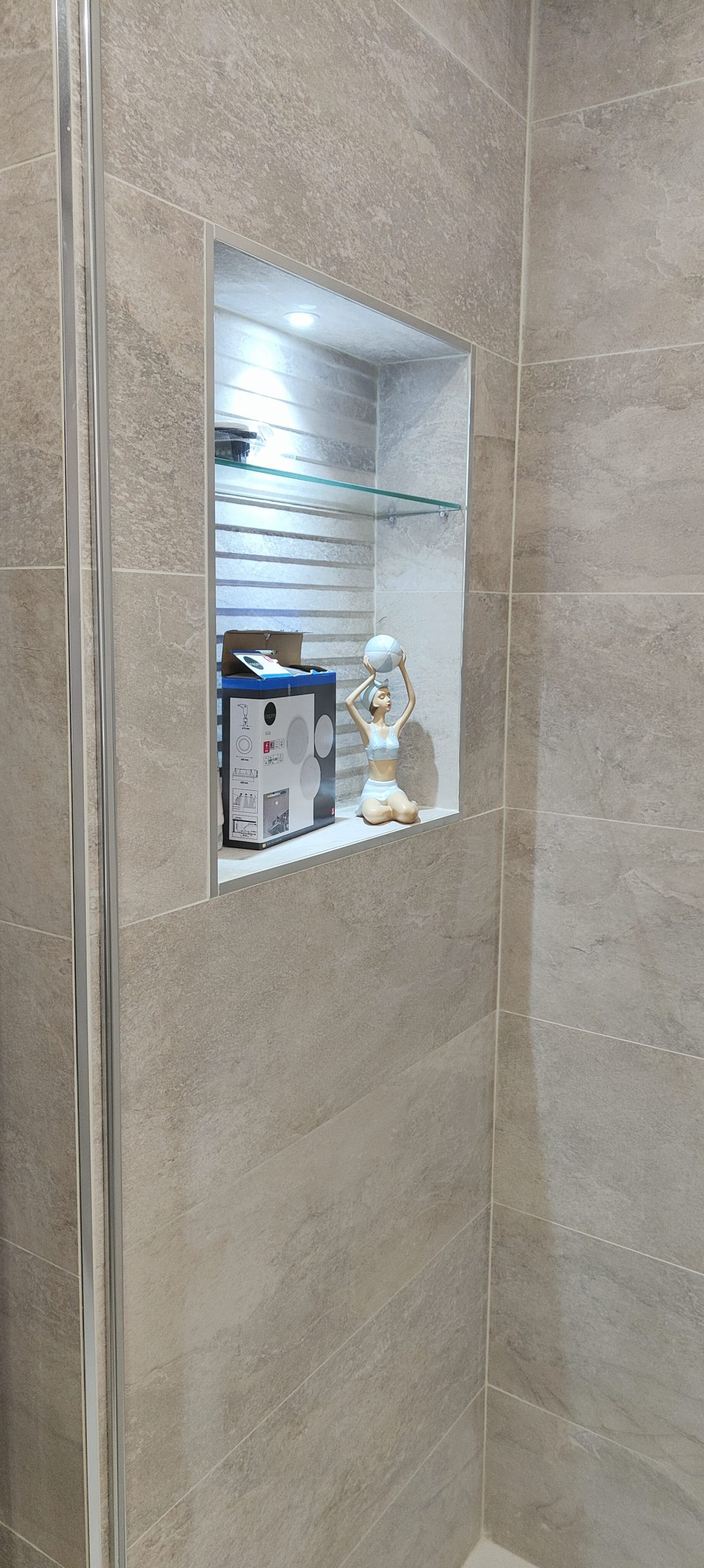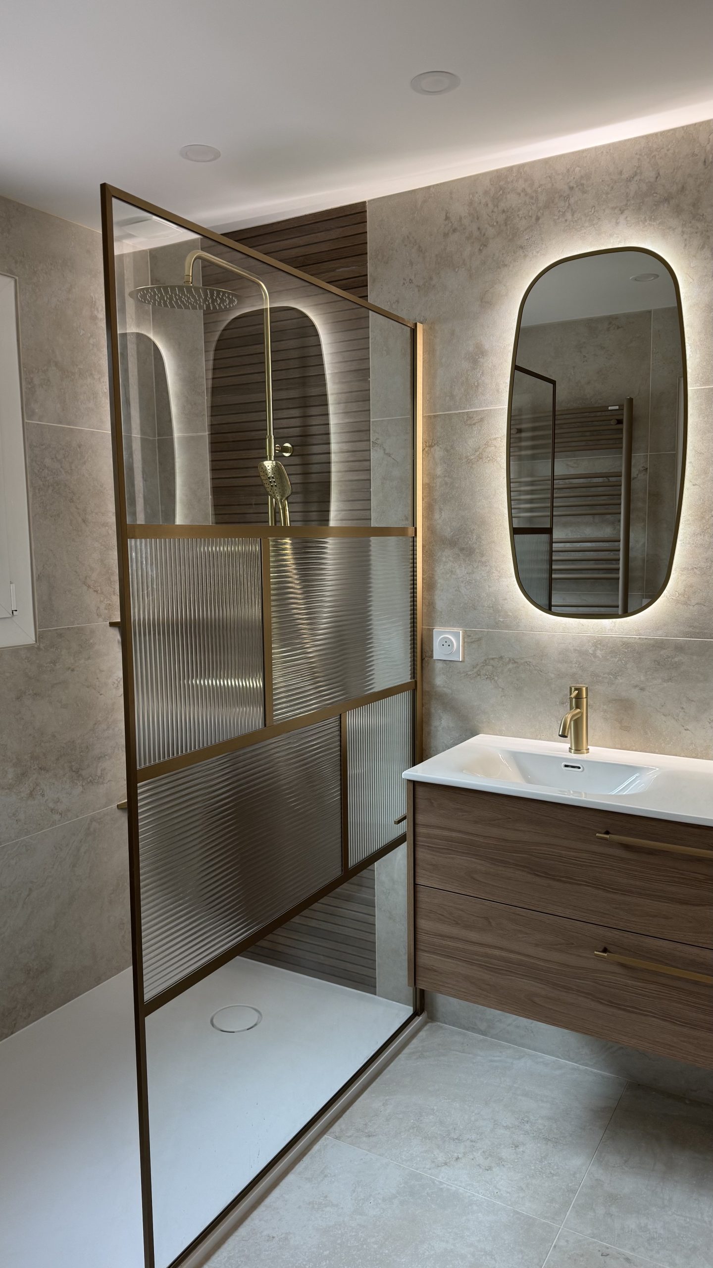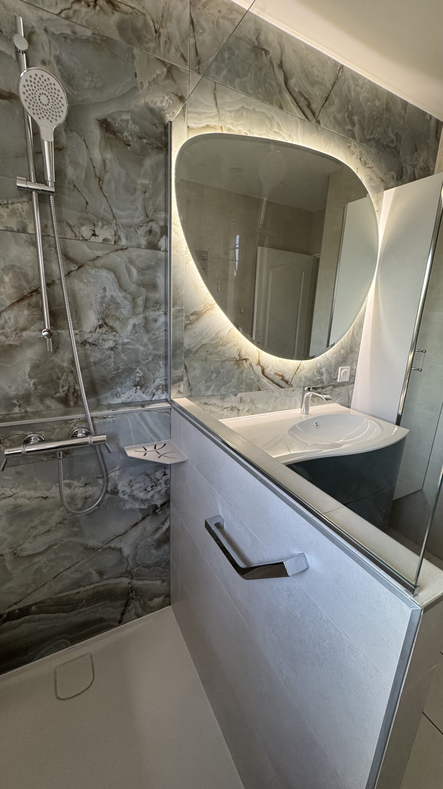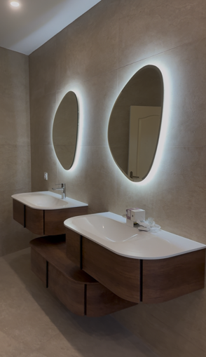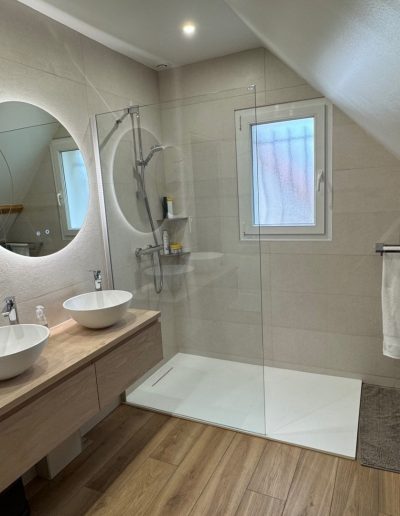 Éclairage & Mobilier : Intégration de miroirs rétro-éclairés à LED, de niches de rangement encastrées et de meubles vasques suspendus pour libérer l’espace au sol et faciliter l’entretien.
