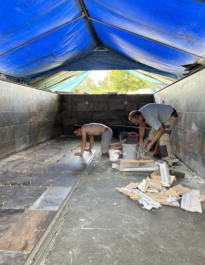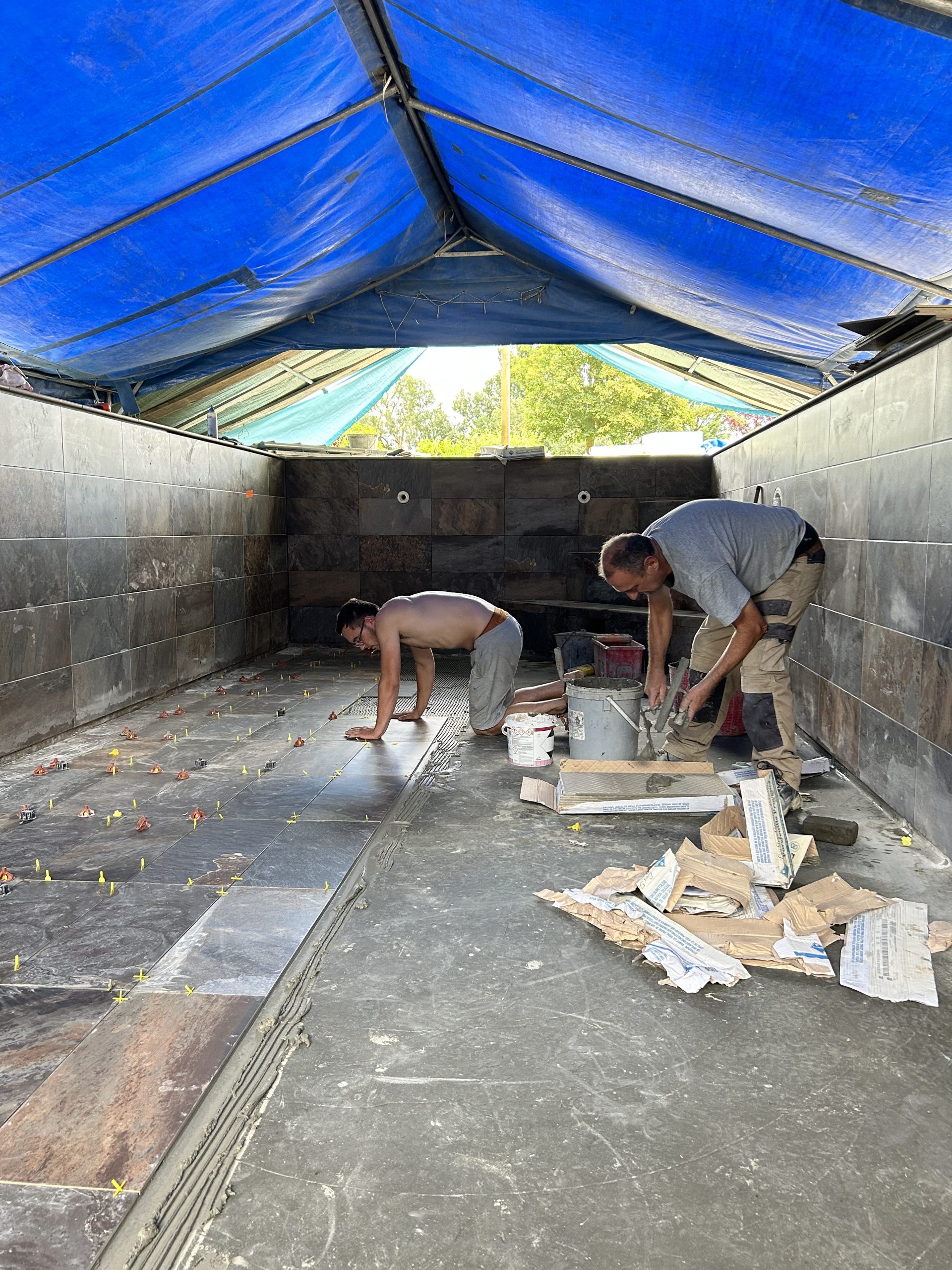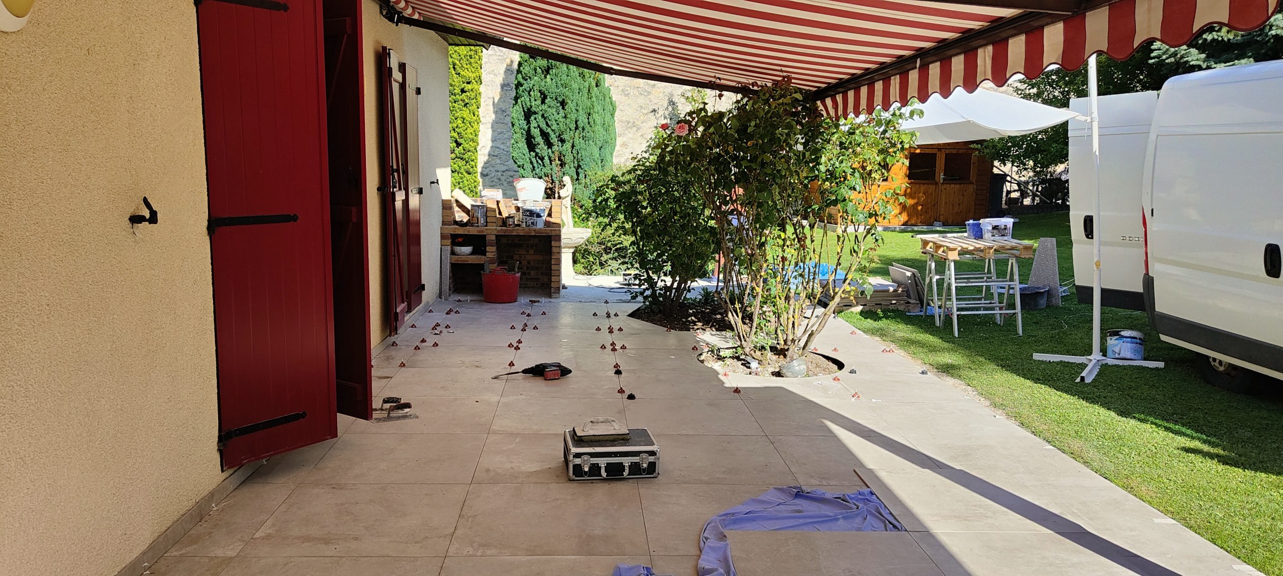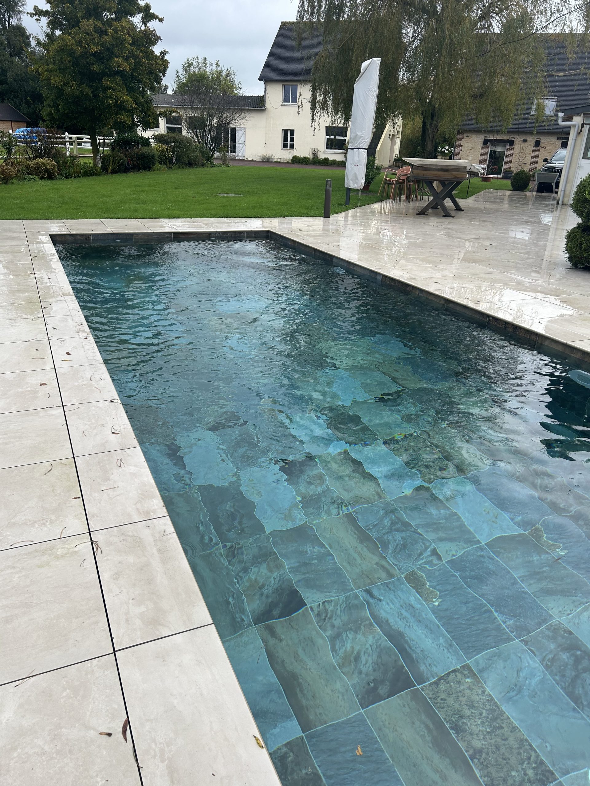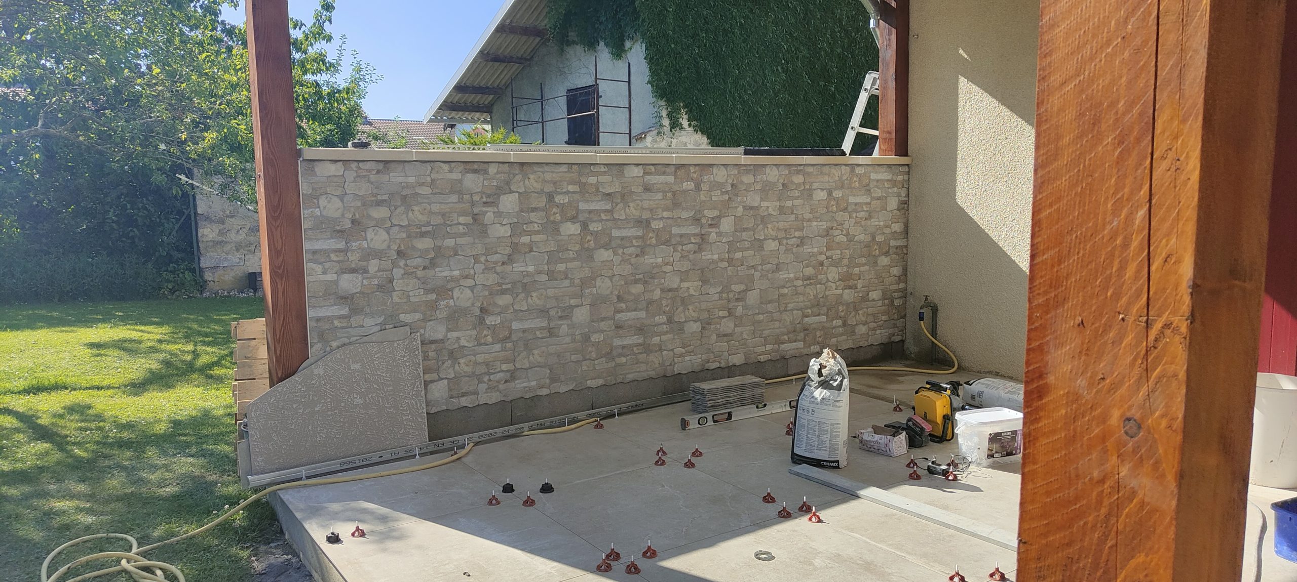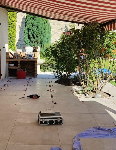 Expertises déployées : Pose de carrelage extérieur (grès cérame), maçonnerie paysagère décorative, électricité extérieure et plomberie de piscine.