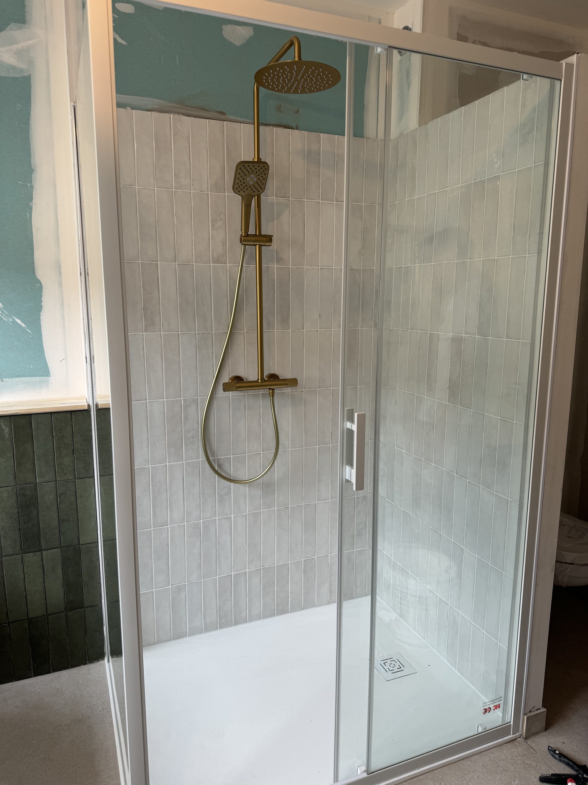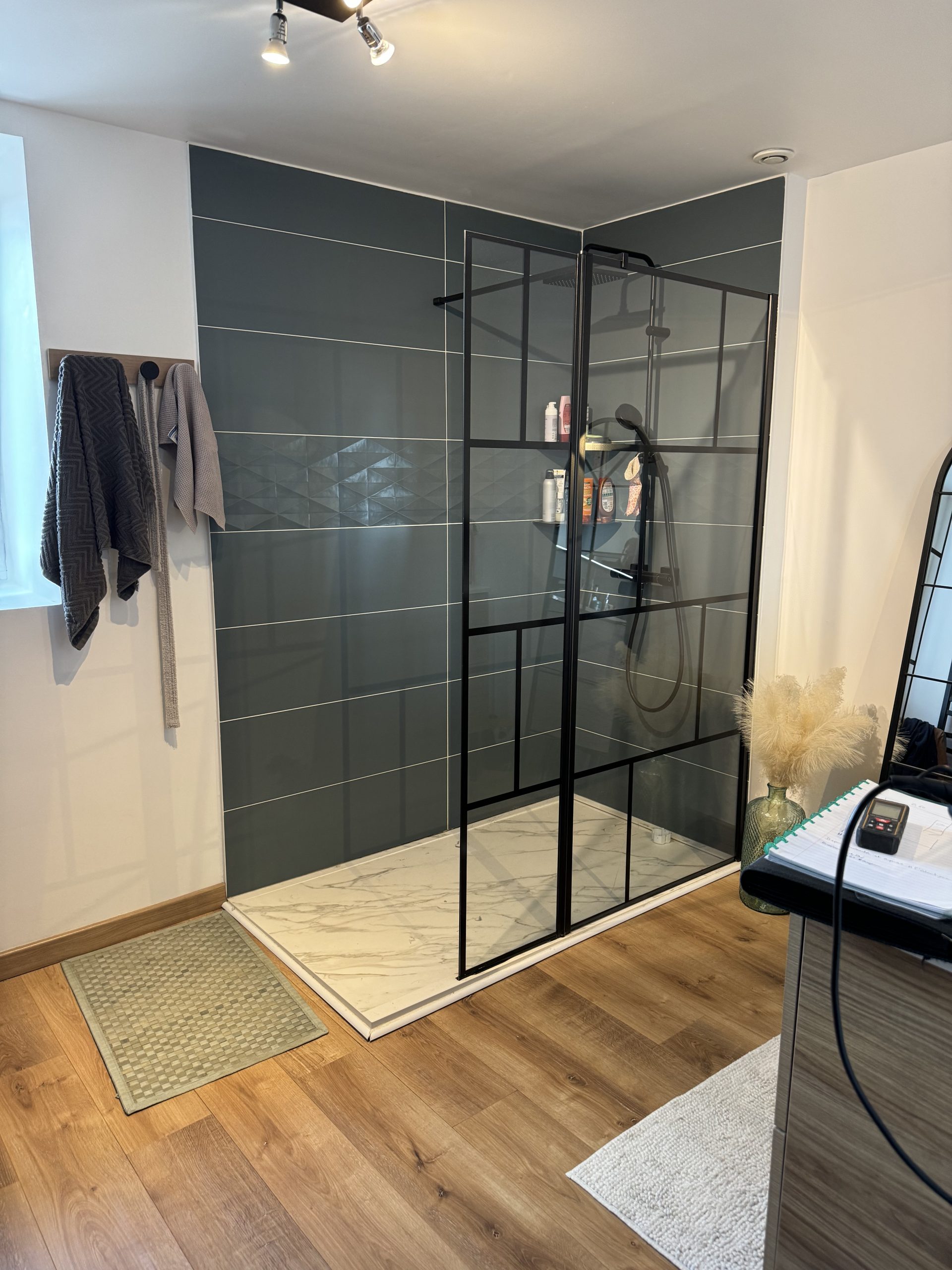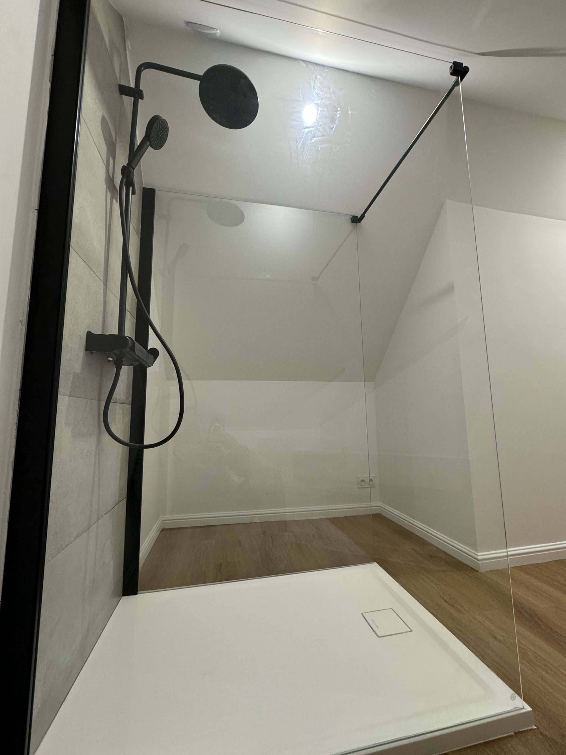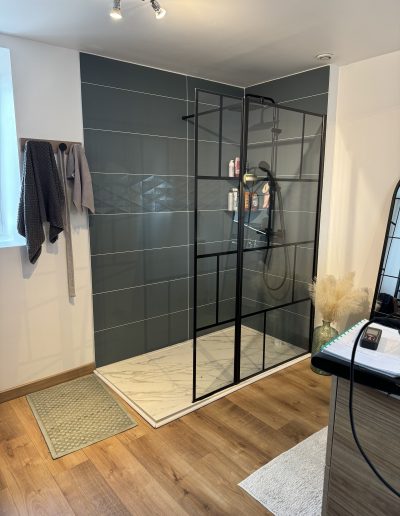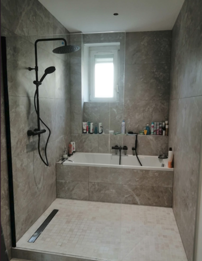 Plomberie et Salle d’eau : Création complète d’un espace sanitaire comprenant une douche à l’italienne avec receveur extra-plat et une robinetterie encastrée pour un design minimaliste.