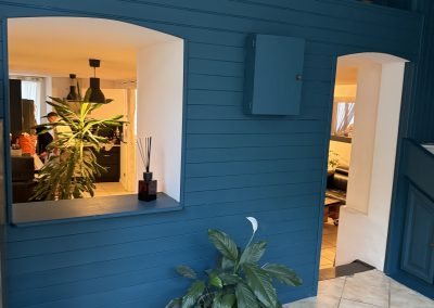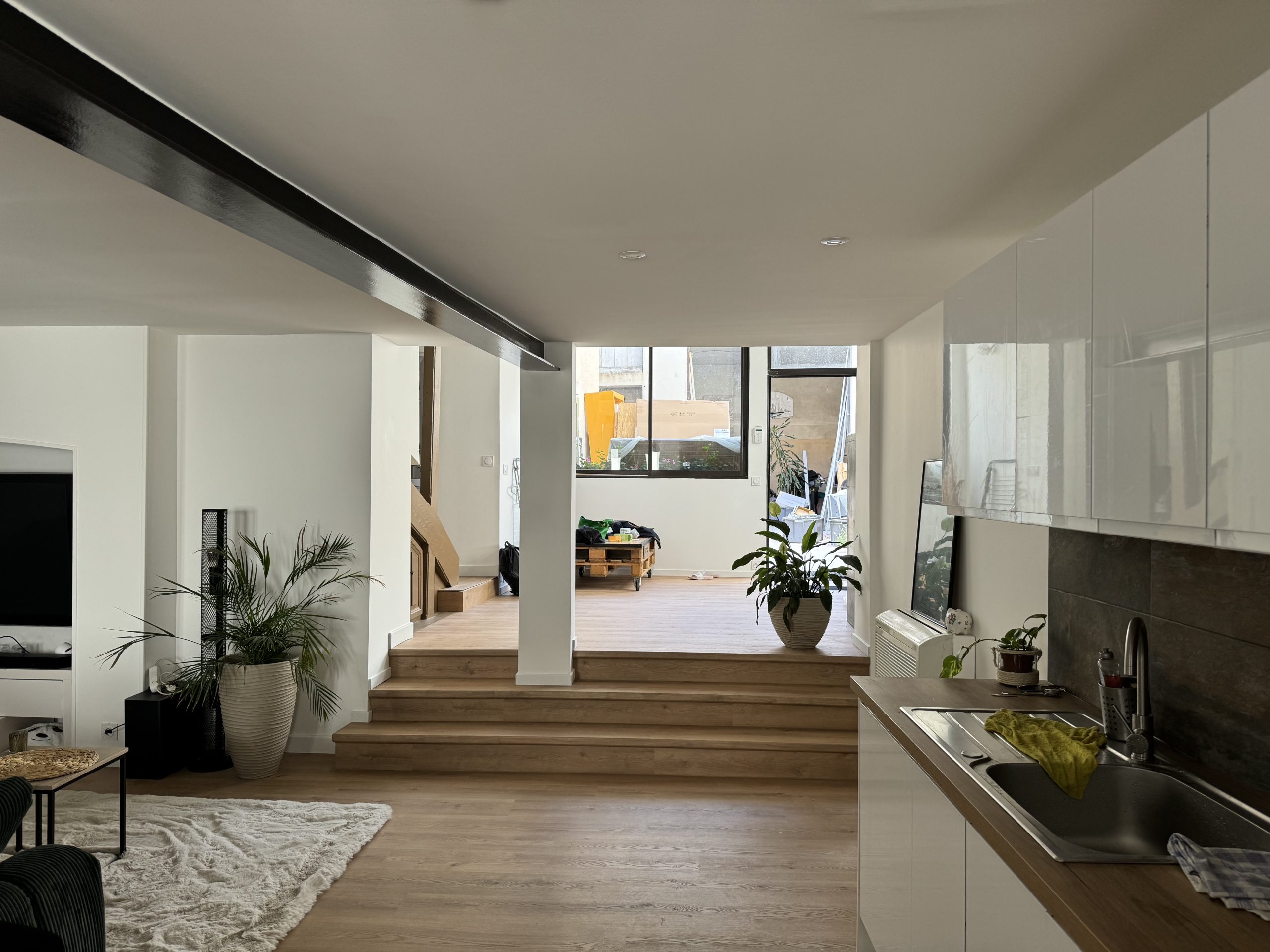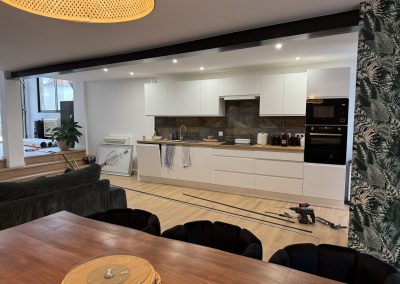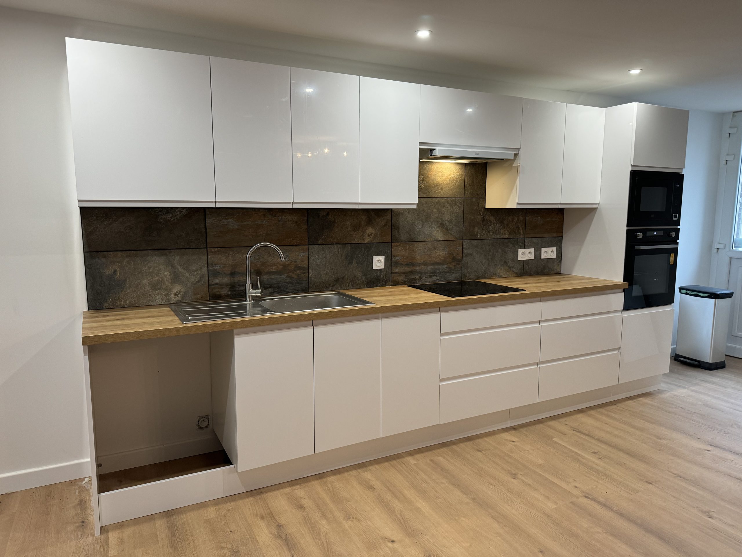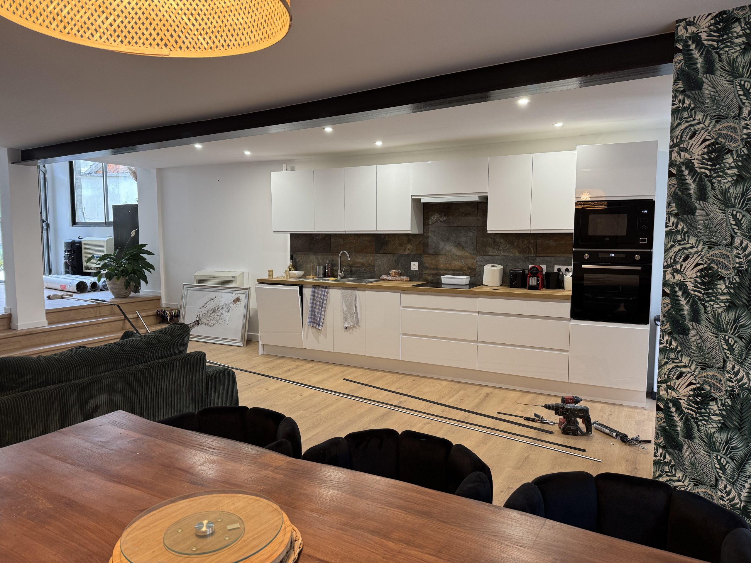 Finitions & Cuisine : Pose d’un sol stratifié aspect bois pour le côté salon, créant un contraste élégant avec l’espace cuisine. Nous avons assuré l’installation des éléments de cuisine, le raccordement de la plomberie et la pose d’une crédence moderne, offrant un résultat « clé en main » prêt à habiter.