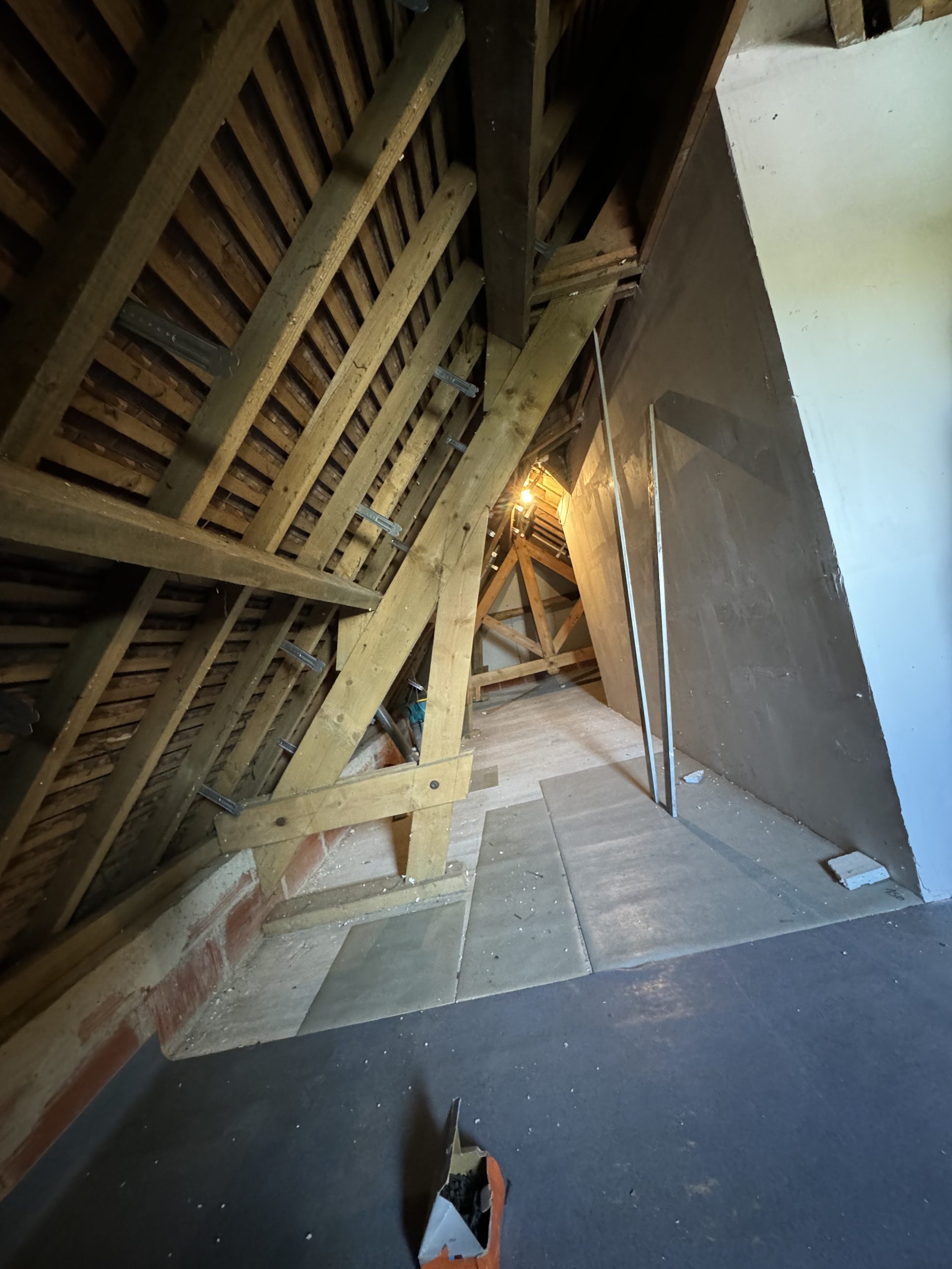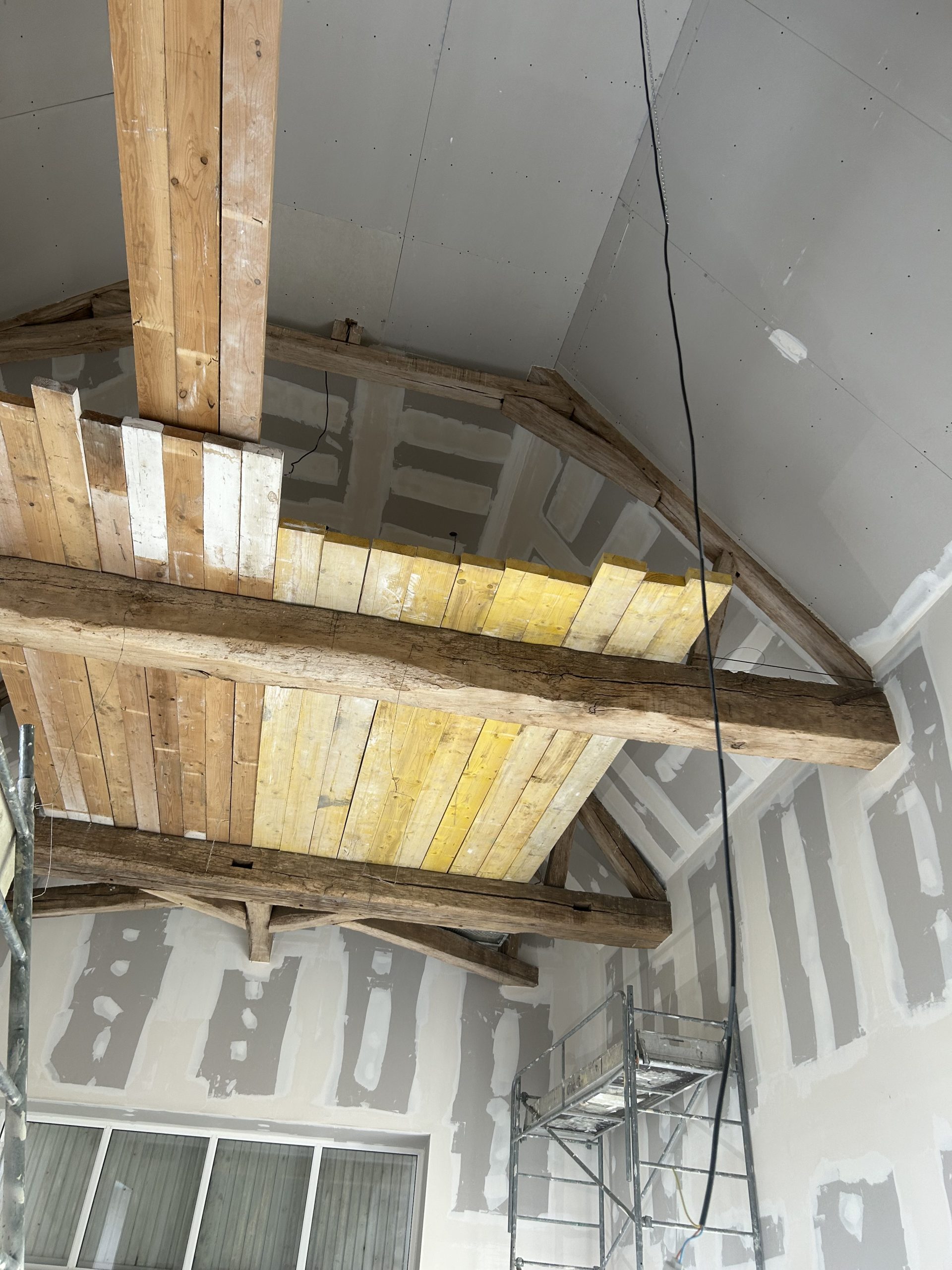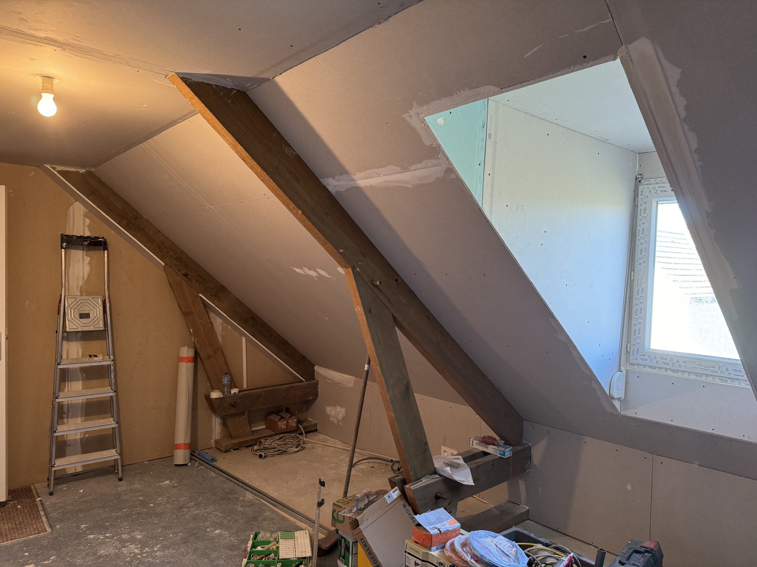 Structure et Isolation : Pose d’une isolation thermique rigoureuse sous rampants et création de cloisons en placo pour définir les nouvelles pièces de vie tout en conservant les poutres apparentes.