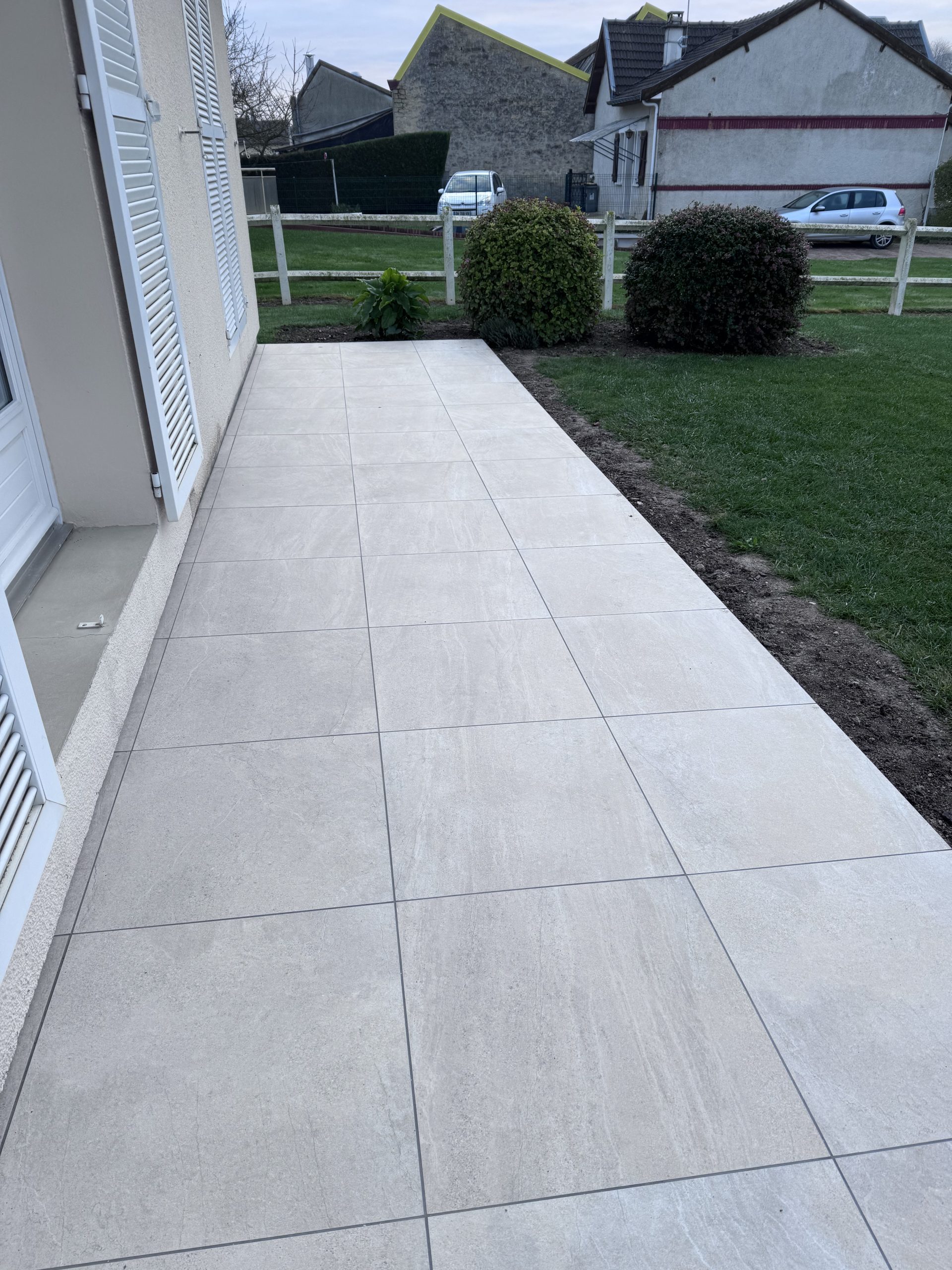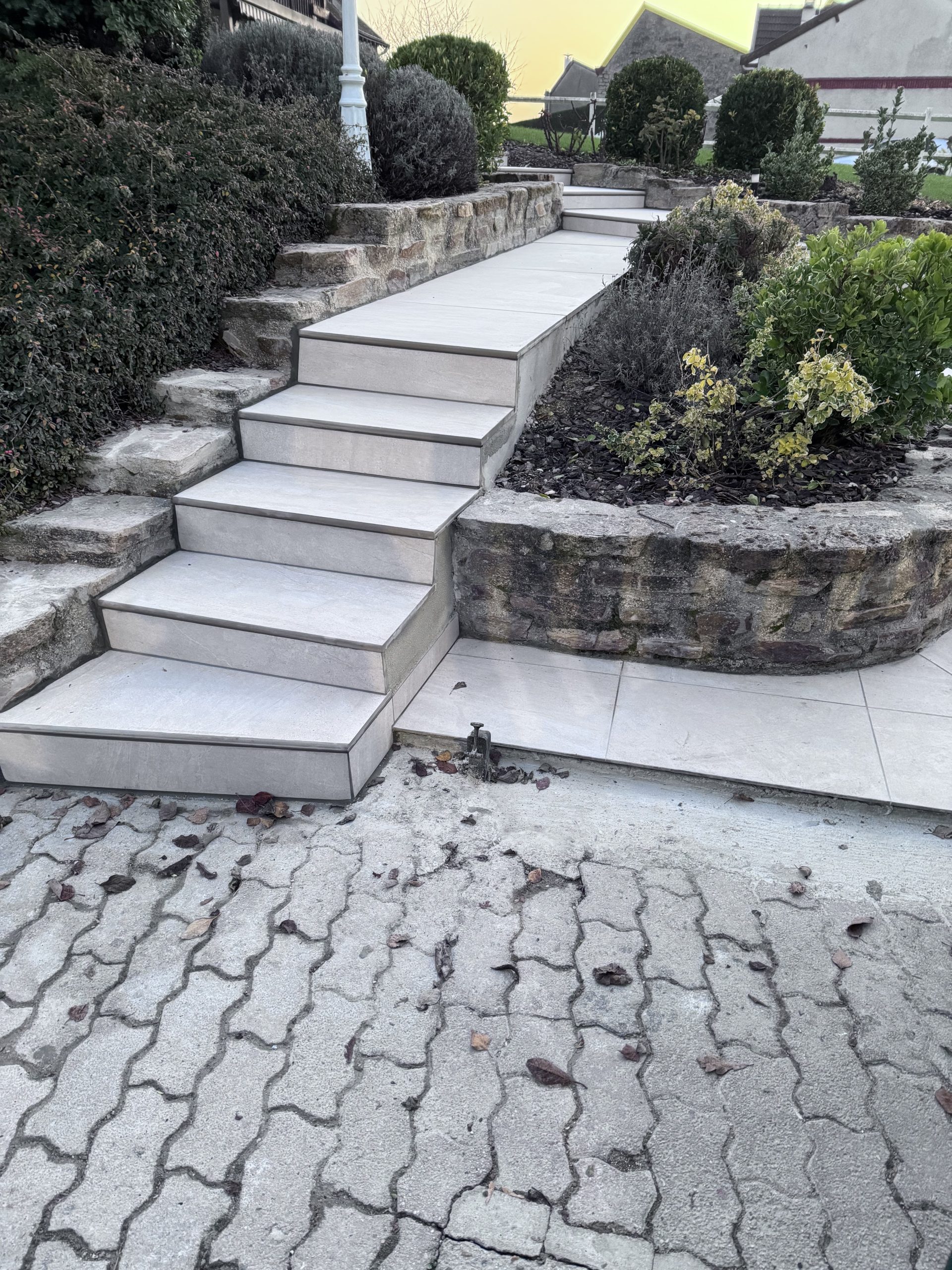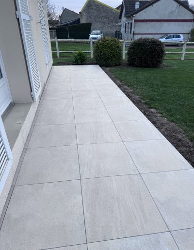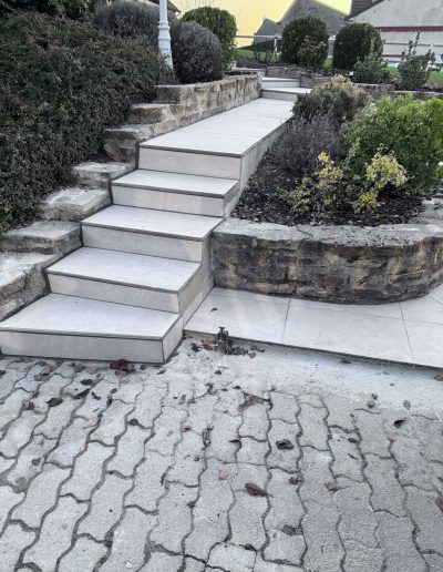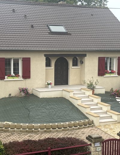 Terrasses et Escaliers : Nous réalisons la pose de carrelage sur plots ou collé, ainsi que l’habillage complet d’escaliers extérieurs. Pour ce projet à Reims, nous avons utilisé des matériaux antidérapants et ingélifs pour garantir sécurité et longévité.
