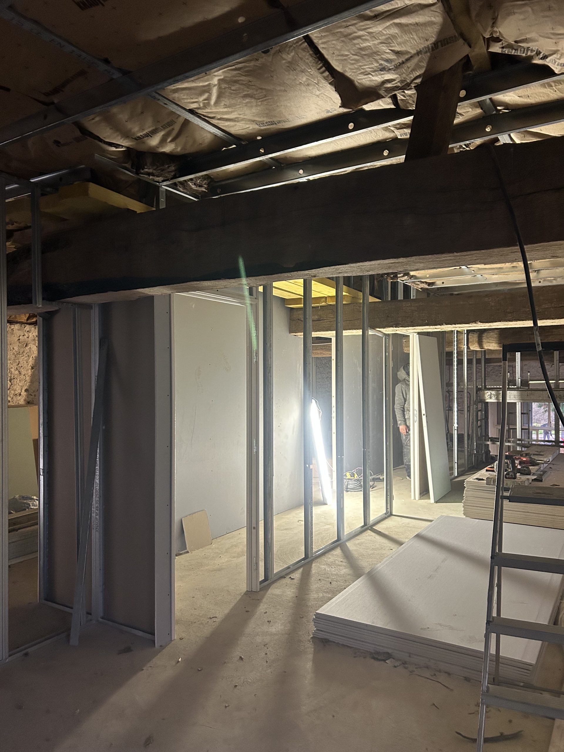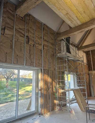 Isolation et Placo : Mise en œuvre d’une isolation thermique performante pour garantir un confort optimal en toute saison, suivie de la pose de plaques de plâtre pour définir les volumes de la chambre et de la salle d’eau.
