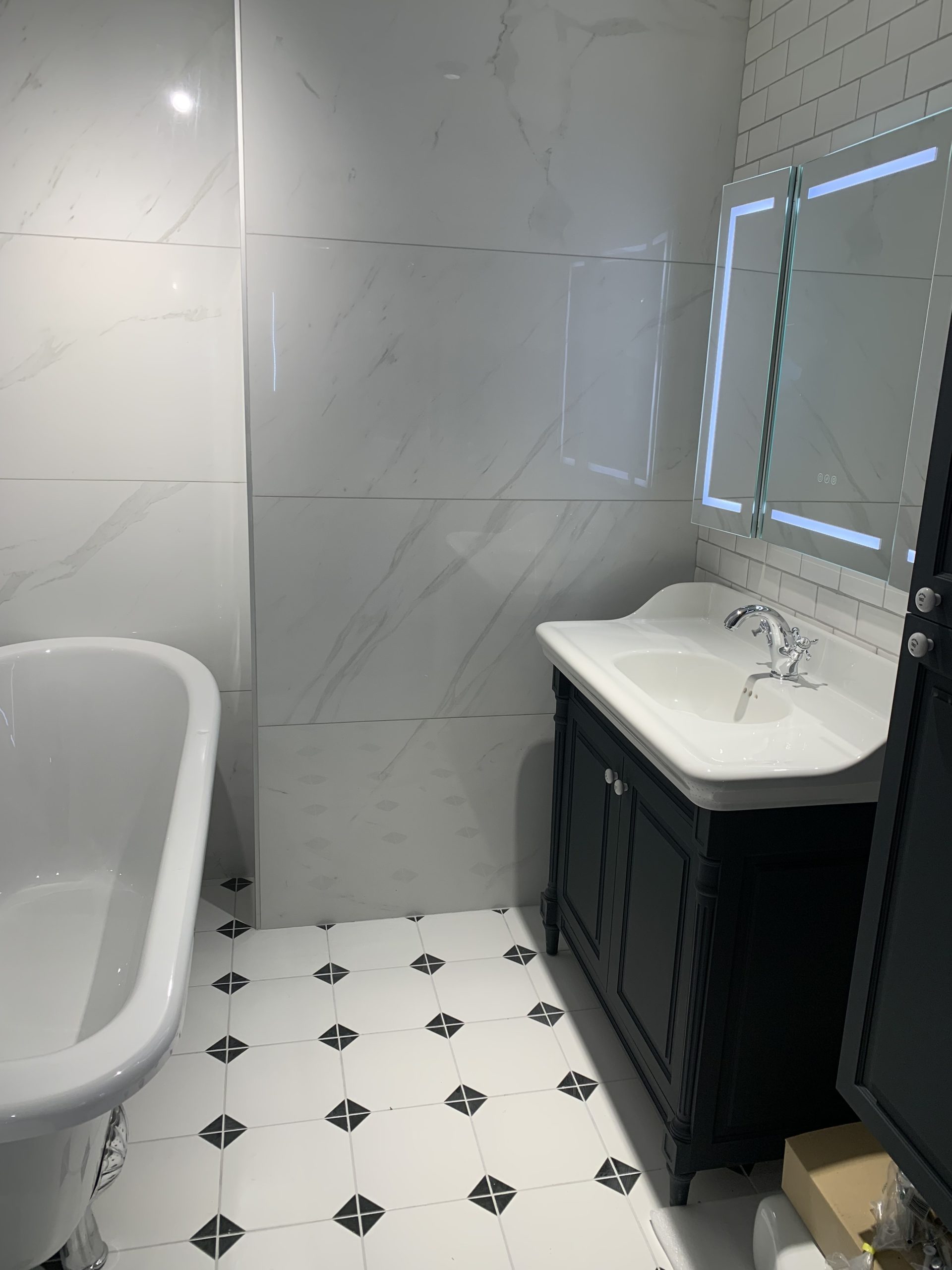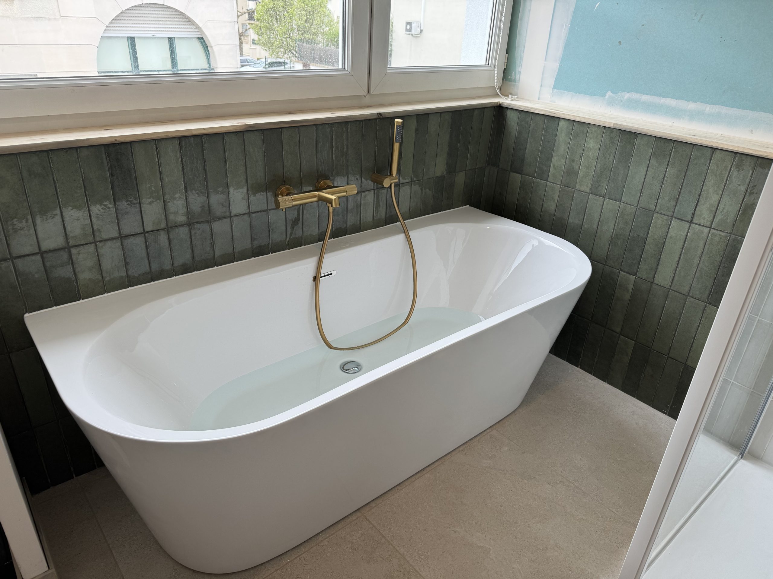 Carrelage & Finitions : Travail de précision sur les revêtements muraux (faïence effet vague, métro ou marbre) et pose de carrelage au sol antidérapant parfaitement aligné.